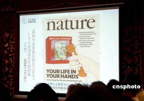 “第一个中国人基因组图谱”(“炎黄一号”)11月6日登上国际学术刊物《自然》杂志的封面故事。深圳市政府联合英国《自然》杂志社7日在深圳举行发布会公布。据称,这一长达七页的长篇论文描绘了第一个亚洲人的全基因组图谱,测序数据总量达到1177亿碱基对,基因组平均测序深度达到36倍,有效覆盖率高达99.97%,变异检测精度达99.9%以上。论文的发表,将成为中国和亚洲基因组研究和医学健康事业发展的历史性文献。中新社发 凌风 摄