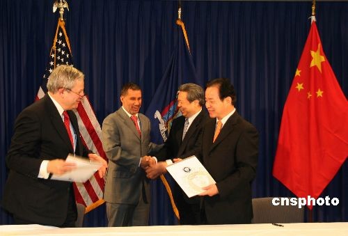 当地时间12月3日下午,纽约州立大学接受中国政府单方面全额奖学金合作谅解备忘录签字仪式,在纽约州长驻纽约办公室签署。中国教育部自2009年起,连续三年每年向纽约州立大学提供十个全额奖学金名额,帮助美国学子到中国进修。纽约州长David Paterson(左二)与中国驻纽约总领事彭克玉(左三)出席签字仪式。中新社发 魏晞 摄