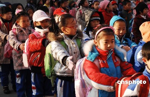 3月2日早,大连鹏辉小学的学生们在操场列队。当日,寒假过后,辽宁大连市中小学2008-2009学年度第二学期开学上课。中新社发 刘德斌 摄