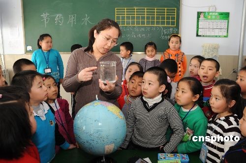 3月20日,黑河市教育系统开展了第十七届“世界水日”和第二十二届“中国水周”宣传活动。联合国确定2009年“世界水日”的宣传主题是"跨界水――共享的水、共享的机遇"。经研究确定,2009年我国纪念“世界水日”和开展“中国水周”活动的宣传主题为:“落实科学发展观,节约保护水资源”。中新社发 邱齐龙 摄
