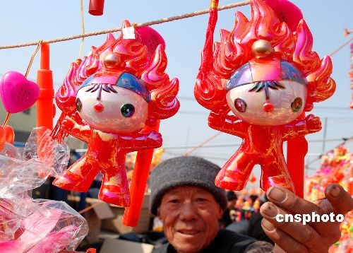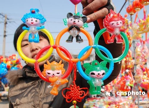 元宵节临近,2月15日,在山东枣庄山亭区农村大集上,与奥运主题相关的居室饰品、时尚花灯等商品备受人们青睐,“奥运经济”格外火爆。中新社发 刘明祥 摄