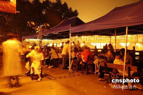 5月12日,汶川地震后雅安市有强烈震感。政府及时发布公告安定人心,医院及时转移病人到安全地方治疗,医护人员、公安干警一直坚守岗位,群众也在空旷地方搭帐篷过夜。中新社发 张国军 摄