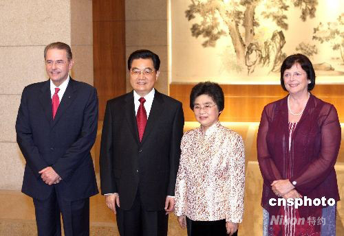 图为胡锦涛夫妇欢迎出席奥运会闭幕式的国际奥委会主席罗格夫妇。