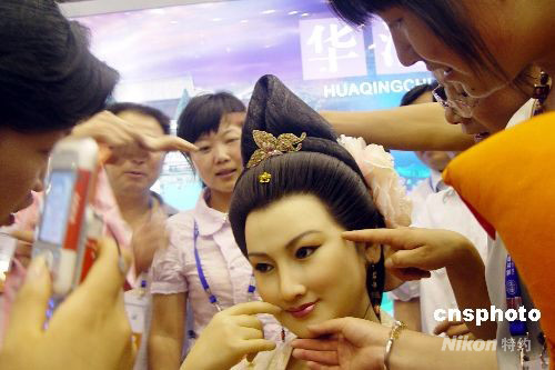 八月二十六日,仿真硅像“杨贵妃”吸引中外客商。当日,第五届中国河南国际投资贸易洽谈会在郑州揭幕,来自美国、英国、德国、韩国、日本等七十多个国家和地区的一万两千余客商与会。中新社发 李志全 摄