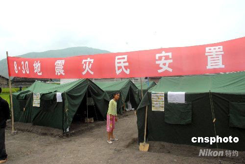 “八·三0”地震发生以后,攀枝花灾区多支救援队第一时间进入灾区实施救援,大量食品、饮用水和一千五百顶帐篷等救灾物资已经陆续发放到灾民手中。目前,全市紧急转移安置人口六万一千三百零一人,全部灾民得到妥善安置。图为攀枝花市盐边县昔格达村紧急抢建的灾民安置点。中新社发 石雨 摄