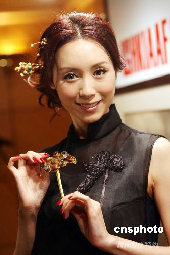 九月十日,香港艺人郭可盈展示明代黄金发饰。当日,香港国际艺展公司向传媒预展一批将在十月四日在“2008香港国际古玩及艺术品博览会”上拍卖的珍品。中新社发 洪少葵 摄