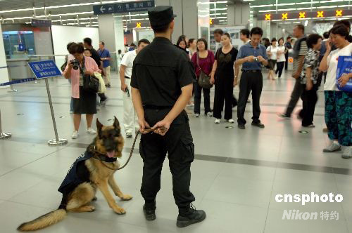 9月10日,北京2008年残奥会正在进行之中,北京市公安局公交总队派出了公交警犬在10号线巡逻执勤,检查易燃易爆物品。图为大批去奥林匹克公园看残奥会和参观的乘客驻足观看执勤的警员和公交警犬。中新社发 邹宪 摄