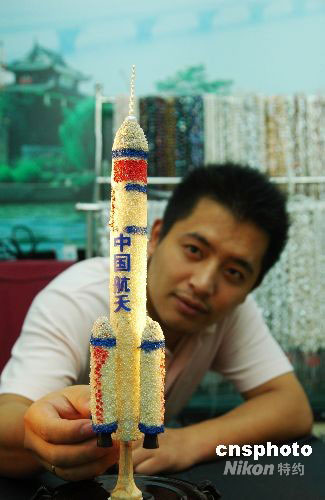 2008年9月25日,一件由天然淡水珍珠串成的神舟七号立体“飞船”亮相苏州市相城区渭塘中国珍珠宝石城。珍珠“神七”立体“飞船”耗费了500余万颗色泽均匀的优质珍珠,由曾获“珍珠工艺超人”称号的苏印珠宝行计晓明师傅耗时3个月制作而成。中新社发 朱子寒 摄