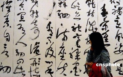10月14日,军旅书法家周剑初在北京中国美术馆推出“五体书法展”,在第二炮兵政治部宣传部主办的“周剑初五体书法展”上,周剑初为大家带来了他习书从艺三十余年来的三十七件呕心力作。作品包含了“篆、隶、楷、行、草”五体,以中国文字的演进为主线,以巨幅狂草为支柱,辅以各式各体,面貌多样、风格各异。图为周剑初书法作品吸引观赏者。中新社发 钱兴强 摄