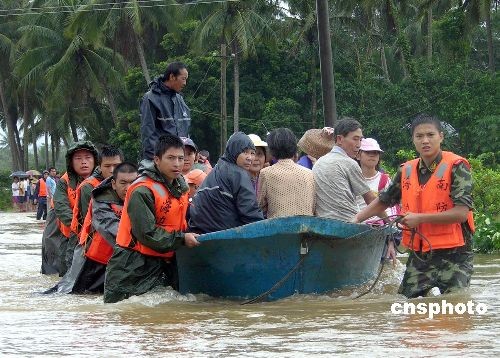 图为十四日文昌边防官兵雨中用冲锋舟转移文昌南阳办事处桃村被洪水围困的两百多名村民。