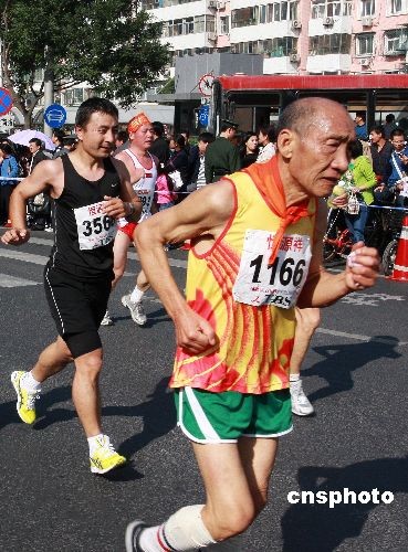 10月19日,2008北京国际马拉松赛在天安门广场鸣枪开赛,近3万人参加这个被列为全球八大马拉松之一的赛事。这是北京奥运会后,北京举办的参与人数最多的、影响最大的赛事,在全程马拉松比赛中,肯尼亚选手包揽男子组前三名,中国揽女子组前三。图为一爷爷级运动员从北京海淀南路经过,路边的观众不断的给其加油助威。中新社发 郑雄增 摄