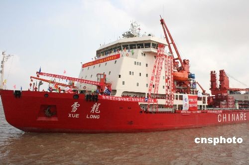 10月20日上午,中国第25次南极科考队出征仪式在上海外高桥极地科考国内基地码头举行。极地科考船“雪龙”号收梯解缆出征。据悉,此次南极科考也是中国极地考察史上历时最长、科考队员人数最多的一次远征,将在南极内陆冰盖的最高点建立中国第一个南极内陆考察站——中国南极昆仑站,并完成中山站建设改造以及南大洋科学考察任务。“雪龙”船往返航程将达24798海里,历时173天,将于2009年4月上旬返回上海。中新社发 陆从兵 摄