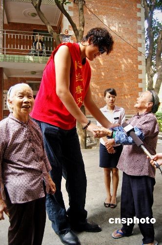 10月21日,受某婚纱影楼的邀请,年仅22岁的“亚洲第一巨人”张欢来到侨乡泉州,展示伟岸“海拔”。张欢身高2.38米,比申报吉尼斯纪录的鲍喜顺(身高2.361米)还高出1.9厘米,堪称亚洲最高、最年轻的巨人。张欢原地立正,手向上伸直后比3.05米的标准篮筐还高出一截。图为张欢与众多市民合影留念。中新社发 傅丹丹 摄