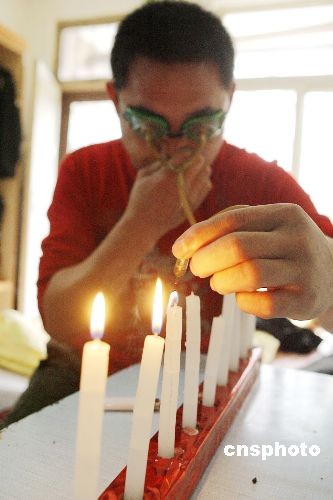10月21日,开封民间艺人凌春江用眼睛将蜡烛吹灭。他戴上特制的眼镜,从两眼中聚气到一根管子内,一分钟吹灭一排蜡烛。如今,身怀绝技的凌春江被中华民间绝技艺术团聘为特邀演员,经常到全国各地巡演。中新社发 慎重 摄