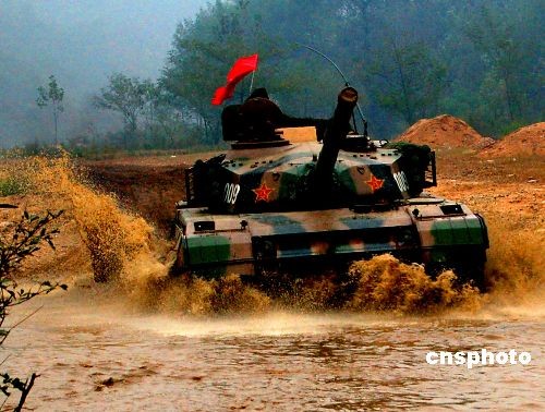 10月21日,豫南桐柏山麓阴雨蒙蒙,“前锋-二00八”迎外演习各参演部队顶住不良天候的影响,在沟壑、河流、树林交织的复杂地域展开了联合一体化训练。这是一场以联合作战为背景的一体化协同“战斗”,着重体现以信息化为主导的火力战,真正实现“信息与火力聚合”、“发现即摧毁”的作战效果;着重体现陆军训练改革的成果,真正把指挥联动、要素融合、营级合同战术等新的训练内容贯穿演练全程。中新社发 张振兴 摄