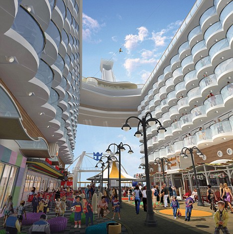 它拥有16层甲板和2700个客房,可乘载5400名乘客,其中还包括了许多两层的超级洋房,简直足以媲美城市里的家。它是首艘有7个明显分区的游轮,分别为中央公园、木板路、皇家步行区、众多酒吧饭店、游泳池和运动区、海洋温泉与健身区、娱乐区和少年区。其中,中央公园位于游轮的第8层甲板上,公园长达100米、宽19米。为了让公园中的植物能茁壮成长,此游轮还将采用小气候控制技术。