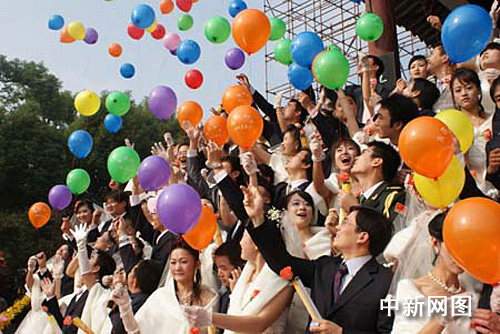 11月5日,2008中国南京世界历史文化名城博览会经典活动之一的“金陵百对新人婚典”,在明城墙下、秦淮河畔的白鹭洲公园喜庆登场。南京市长蒋宏坤亲临现场为一百零八对新人证婚祝福。作者:门学梅