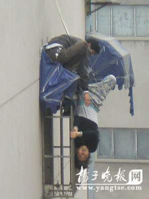 6日中午11:45左右,南京金碧花园小区内的一名老年妇女不慎从6楼阳台窗口失足坠落。幸亏被5楼的雨篷接住,老妇左腿倒挂在雨篷上,在空中悬了十余分钟,终于被家人救回。本报热心读者盛先生用手中的相机,记录下了这感人的一幕。