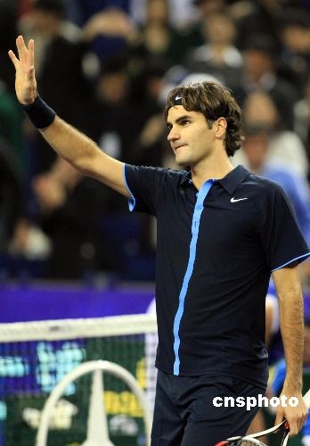 11月12日,在上海旗忠网球中心进行的上海大师杯单打红组比赛中,由于罗迪克因扭伤脚踝临时退赛,世界排名第27位的捷克选手斯泰潘内克替补出战。世界排名第二位的瑞士天王费德勒尽管出现了很多失误,但最终还是以7-6(4)/6-4的比分取得了比赛胜利,迎来了自己今年在上海的首场胜利,保留了小组出线的希望。中新社发 汤彦俊 摄