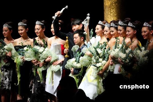 11月12日,中国国际时装周(2009春夏系列发布)在北京落幕,女模刘多、男模孟飞分别获得2008年度中国最佳模特,著名设计师祈刚获得代表中国服装设计最高奖项的“金顶奖”。中新社发 盛佳鹏 摄