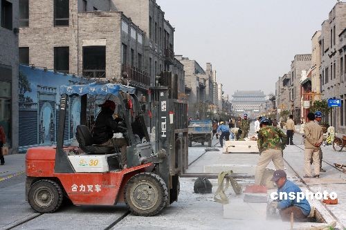 11月14日, 北京前门大街南段,长50米、宽10余米的路段用警戒线围了起来,施工人员正在对路面及其它设施进行维修保养。届时,备受关注的前门大街“铛铛车”也已清洗一新,即将载客运行,那“铛铛”的声音时隔42年后将再次回到前门大街。8月7日开街以来,前门大街已接待1000多万的游客,这是开街3个多月来第一次路面保养。中新社发 郑雄增 摄