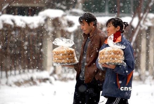 12月2日,新疆乌鲁木齐市两位维吾尔族市民手捧为即将到来的古尔邦节特意购买的馓子,匆忙回家。受西西伯利亚南下的强冷空气影响,从12月1日白天开始到2日夜间,新疆主要以降温大风天气为主,同时新疆北部地区将有较明显的降雪。中新社发 刘新 摄
