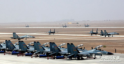 空军航空兵某师接受对抗训练的飞行员在某飞行试验训练基地进行大强度训练,战机频繁起降,机场一遍忙碌。
