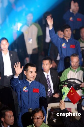 图为翟志刚、刘伯明、景海鹏三位航天员进入会场受到热烈欢迎。中新社发 武仲林 摄