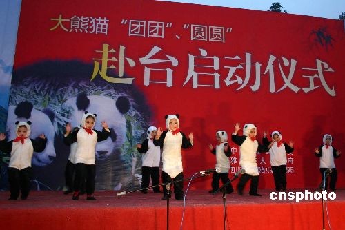 12月23日是赠台大熊猫“团团”、“圆圆”飞赴台湾的日子,“团团”“圆圆”离开四川,雅安民众举行了热烈的欢送仪式。图为当地的“熊猫宝宝”表演舞蹈《熊猫情》。中新社发 霍潺 摄
