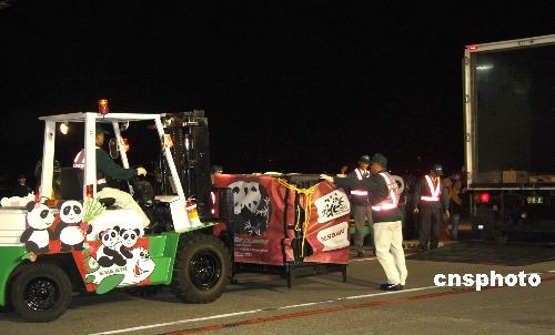 大陆赠台大熊猫“团团”、“圆圆”在台北桃园机场被装上专车,即送往台北市动物园,入住新家。
