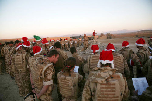 阿富汗哈尔门德省的黄昏,落日挂在灸烤了一天的大地上。英国海军陆战队的士兵们戴着圣诞帽,集结在战争纪念碑前,唱起圣诞节颂歌。