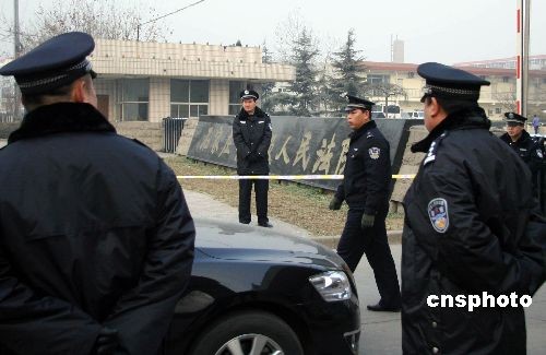 12月26日起,震惊全国的三鹿奶粉案在河北陆续开庭审理。当日上午,石家庄市中级人民法院开庭公开审理张玉军、张彦章非法制售三聚氰胺案。 三鹿奶粉事件发生后,张玉军、张彦章被石家庄市人民检察院“以危险方法危害公共安全”罪提起公诉。图为警方在法院门口拉起警戒线。