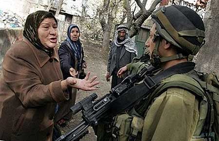一名巴勒斯坦妇女与一名以色列士兵进行交涉,要求他释放她的儿子。