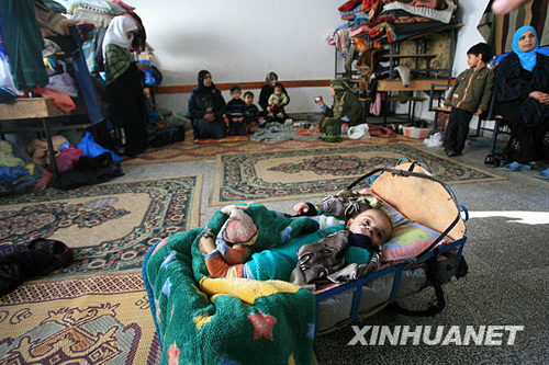 1月3日,在加沙地带南部拉法,很多巴勒斯坦难民临时寄居在一个难民营的学校里。以色列对加沙的空袭已造成约470人死亡、2400人受伤。许多巴勒斯坦人家园被毁,流离失所。 新闻图集:以军开始发动地面进攻