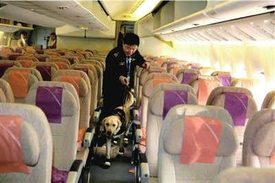 两条拉布拉多缉毒犬日前登上北京首都国际机场T3航站楼一架来自阿联酋的飞机机舱,执行查毒任务。北京海关在13日召开的新闻发布会上称,这是中国海关首次让缉毒犬登机检查。