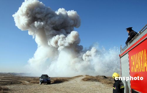 1月14日,北京警方在大兴对收缴的3000多箱、价值100多万元的劣质烟花爆竹进行集中销毁。 中新社发 杜洋 摄