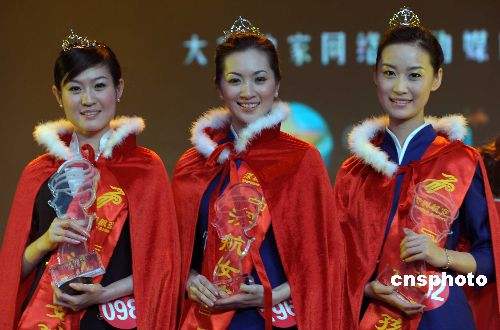 一月二十一日晚,台湾籍空姐曾怡纶(中)夺得“深航女孩”总决赛冠军,空姐常艺(左一)、魏祯(右一)分别获得亚、季军。