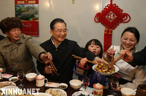 1月25日,温家宝总理在汶川映秀镇板房安置小区吴志远家吃年夜饭。这是温家宝请大家品尝他刚炒出的回锅肉。1月24日至25日,中共中央政治局常委、国务院总理温家宝来到四川受灾最为严重的北川、德阳、汶川等地,和灾区人民一起过年。作者:姚大伟