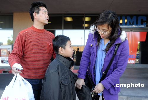 当地时间2月1日下午2时左右,遭遇车祸的吴守桂(左)、包瑞华(右)夫妇带着八岁的儿子吴双走出拉斯维加斯大学医疗中心(UMC),乘车前往酒店。吴守桂说,他们现在最大的心愿就是尽快回国,好好调整心理,继续疗伤。一月三十日下午,一辆载有中国游客的旅游车在美国亚历桑那州发生车祸,造成七死十伤。吴守桂称自己是不幸中的万幸,一家三口是所有乘客中伤势最轻的,夫妇俩昨天就出院了,今天八岁的儿子也顺利出院。中新社发 张炜 摄