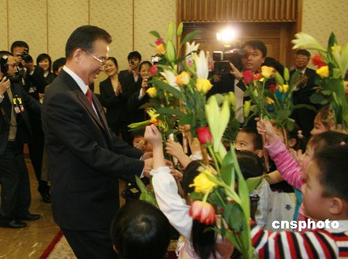 当地时间2月1日中午,正在访英的中国总理温家宝前往中国驻英使馆,向使馆工作人员及家属拜年,并亲自动手与他们一起包饺子。图为温总理受到使馆小朋友的热烈欢迎。中新社发 李鹏 摄