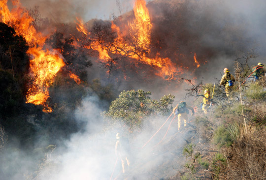2月1日,消防队员拖着灭火水龙头靠近正在熊熊燃烧的山火。当日,洛杉矶Sunland地区的210高速公路附近发生山火,至少约20英亩的山林已被烧毁,有官员称,大火是由汽车着火引发的。