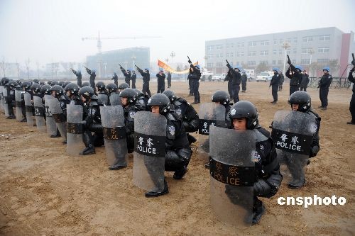 2月12日下午,河北廊坊开始下起小雨,由山东公安边防总队组建的中国第八支赴海地维和警察防暴队在雨中进行处置群体性事件训练。中新社发 由永怀 摄