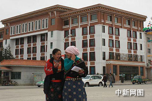 中新网2月24日电 2月24日,两名藏族群众从甘南藏族自治州合作市一栋藏式建筑前经过。这座高原羚城对全市28栋新建、续建、扩建建筑物进行了民族特色风貌式样控制和改造,还将民族特色化建设延伸和辐射到农牧村,力争把草原新城合作市打造成甘肃、青海、四川藏区一流的民族文化特色城市。