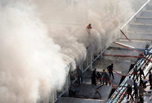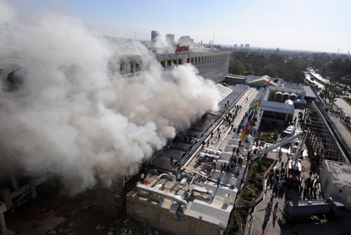 2月26日,位于巴基斯坦首都伊斯兰堡的万豪酒店发生火灾,造成4人受伤。图为消防人员正在灭火。