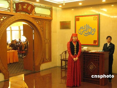 3月2日,在全国政协委员入驻的北京友谊宾馆,服务员穿起民族服装,迎接参加会议的委员到伊斯兰餐厅用餐。中新社发 张子扬 摄