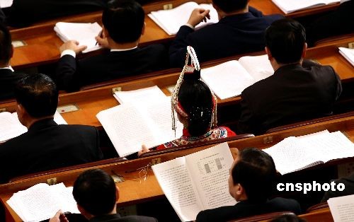 3月5日上午,十一届全国人大二次会议在北京人民大会堂开幕,国务院总理温家宝作《政府工作报告》,参会代表边听边认真阅读报告文本。中新社发 杜洋 摄