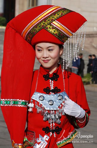 3月5日上午,是十一届全国人大二次会议在人民大会堂内开幕的时间,会场内代表委员们为温总理精彩的政府工作报告鼓掌喝彩,会场外人民大会堂东侧门口的广场上也因这些姑娘们的出现而光彩靓丽。她们是此次大会的壮族礼仪姑娘们,她们有着与60年共和国的旗帜一样的色彩——中国红!