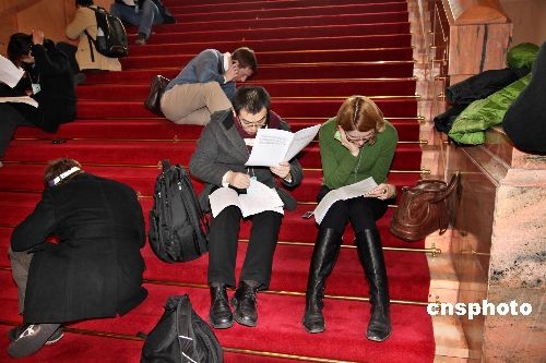 2009年3月5日上午,在北京人民大会堂内的台阶上,各国记者忙着发稿。今年两会,3000多名中外记者云集北京,外国记者就达到800多名。今年两会是平年例会,但报名参加的外国记者与去年换届之年不相上下。西方主流媒体派出记者人数增多,如路透社、法新社、彭博社等派出记者人数都超出了去年的规模。中新社发 王保胜 摄