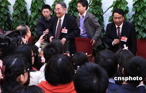 3月6日下午,全国政协十一届二次会议记者会在北京人民大会堂举行,厉以宁、李德水、方方、王文彪、陈锡文五位全国政协委员到会答记者问。记者会结束时,被中外记者追堵采访。中新社发 宋吉河 摄