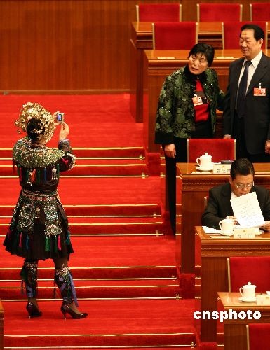 3月9日,十一届全国人大二次会议在人民大会堂举行第二次全体会议,身穿少数民族服饰的女代表会前在主席台上为参会代表拍纪念照。中新社发 杜洋 摄